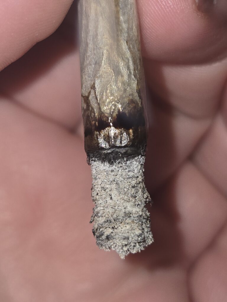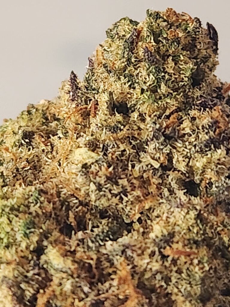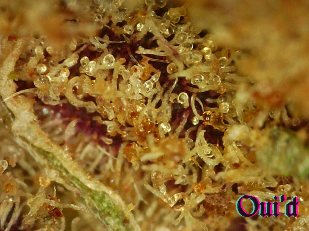 Des buds de moyenne taille, denses et compacts, humidité balancée. Beau bag appeal, belle structure et trim. Une dentelle de trichomes pare les teintes de vert-bleu foncé et violet des fleurs. Sous microscope, les trichomes sont majoritairement intacts et gorgés d’anthocyanes(pigments naturels). Se fume sans problème avec une cendre blanchâtre et un anneau de résine.