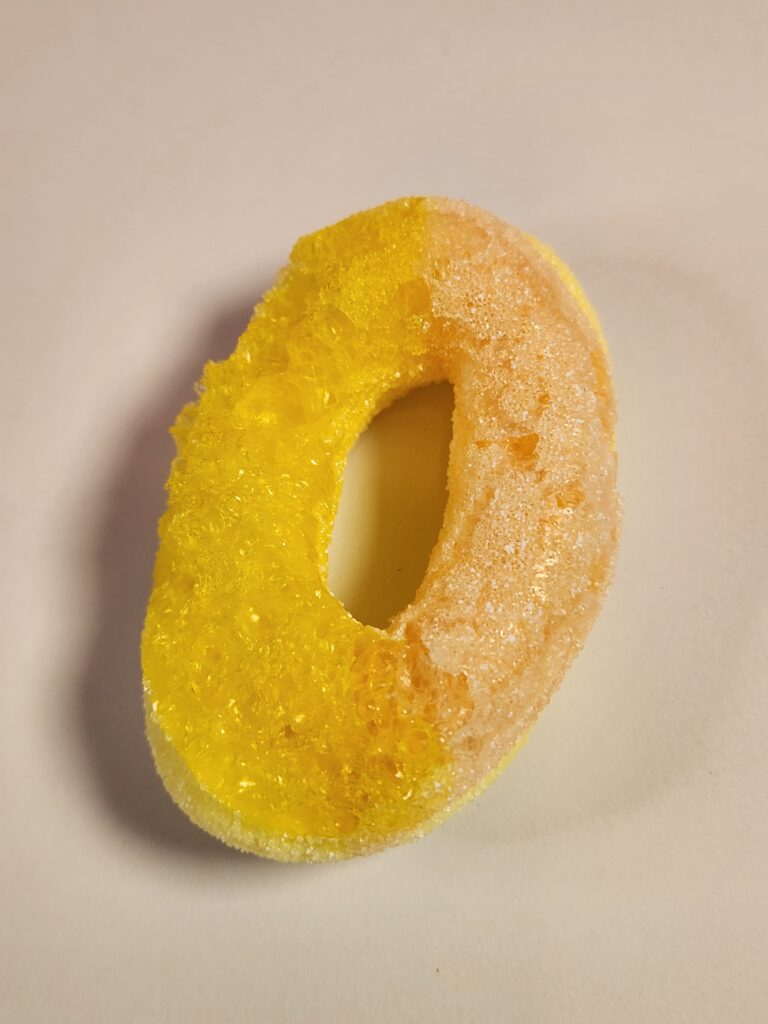 Le Peach Ring, bonbon classique normalement de texture gummy et saupoudré de sucre et acide citrique maintenant sous forme lyophilisée. La lyophilisation, de plus en plus populaire, est un processus de séchage à froid qui retire l’eau d’un produit congelé sous vide, permettant sa conservation prolongée tout en préservant ses propriétés nutritionnelles. Le bonbon a gonflé, a perdu le plus gros de son poids et est maintenant fragile/craquant. La texture en bouche serait similaire à un Cheetos, croustillant et fluffy à l’intérieur, ça fond rapidement sur la langue.
