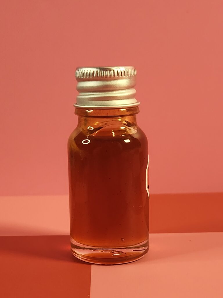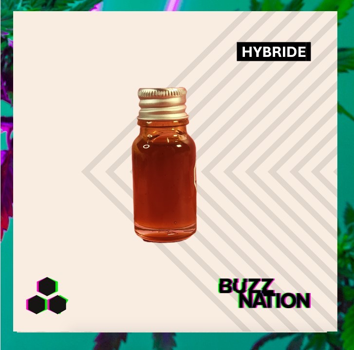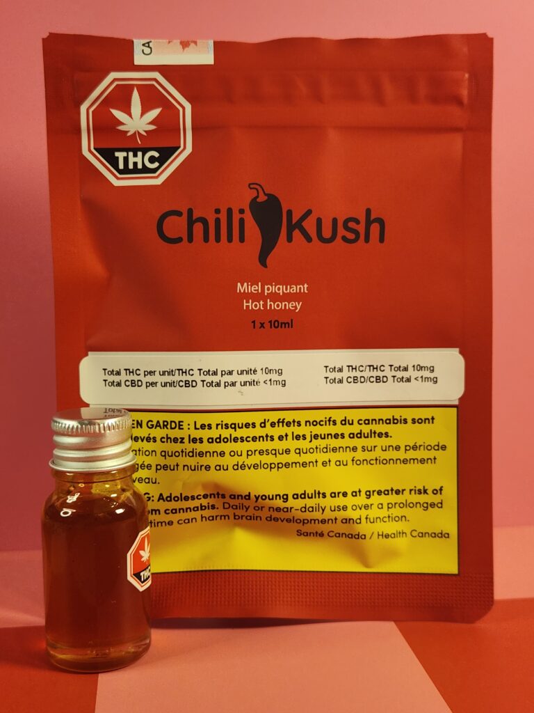 Un moyen sac en mylar de couleur rouge écarlate contenant une petite bouteille/fiole de verre de 10ml remplie de miel infusé et un bâtonnet de bois pour mélanger et verser le contenu. L’étiquette mentionne les concentrations de THC(10mg)/CBD(<1mg) par unité, la valeur nutritive, ingrédients(miel, ail, granulé biologique, épices, vinaigre de cidre de pomme, extrait de cannabis), une échelle de niveau de piquant(niveau 1 sur 4) et la mention « miel du Québec, infusé avec du piment, de l’ail et notre extrait de cannabis ». Une belle description généreuse.