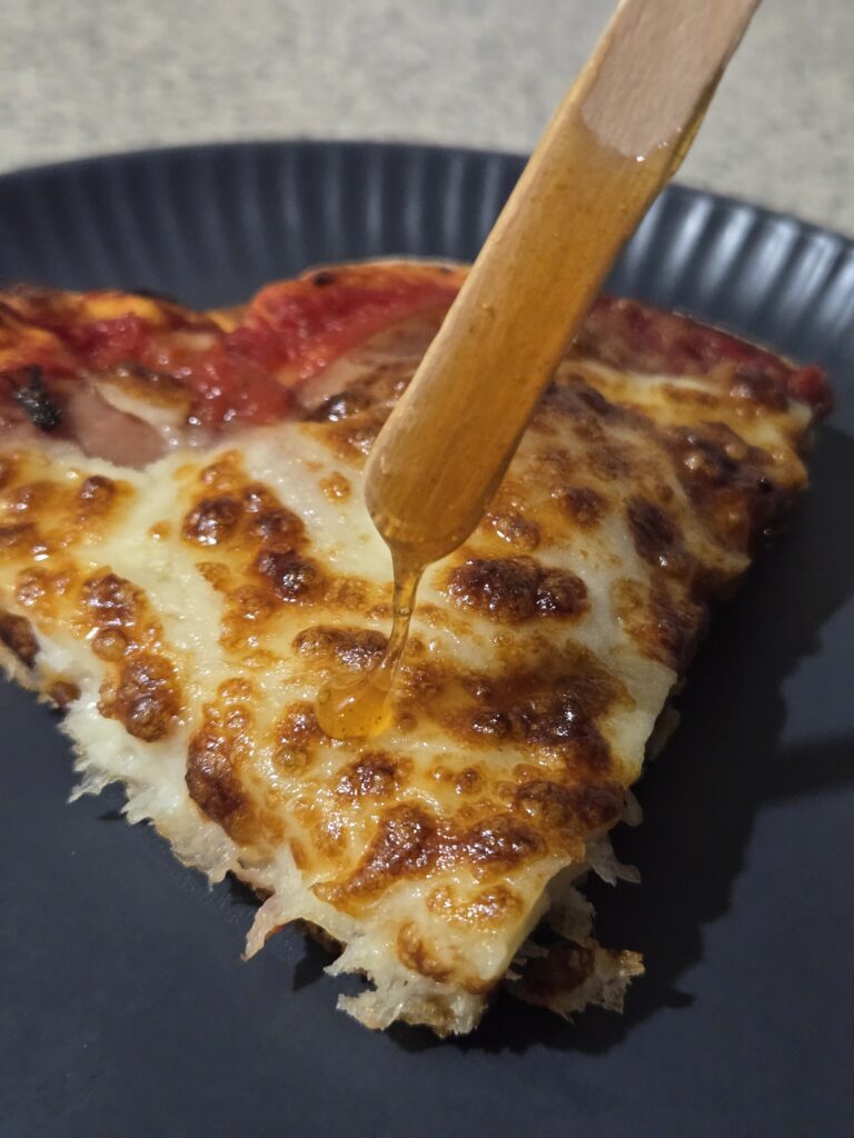 Au nez, ça sent le miel, le piment, l’ail et le vinaigre de cidre de pomme. En bouche, c’est sucré mais pas trop, ça feel miel artisanal plus que commercial, y’a le p’tit kick d’ail et de piments qui vient chatouiller la gorge. J’ai combiné avec une pizza pepperoni/fromage et ça se mariait vraiment bien avec le salé du fromage, ça m’a d’ailleurs inspiré d’autres recettes à essayer avec le miel.