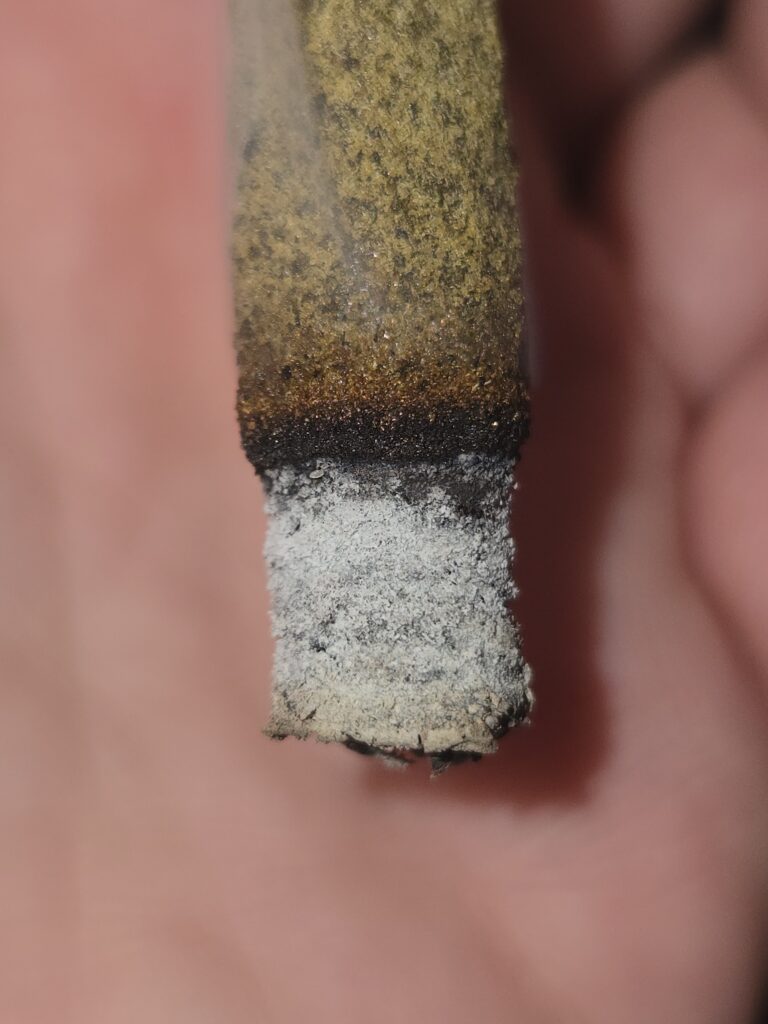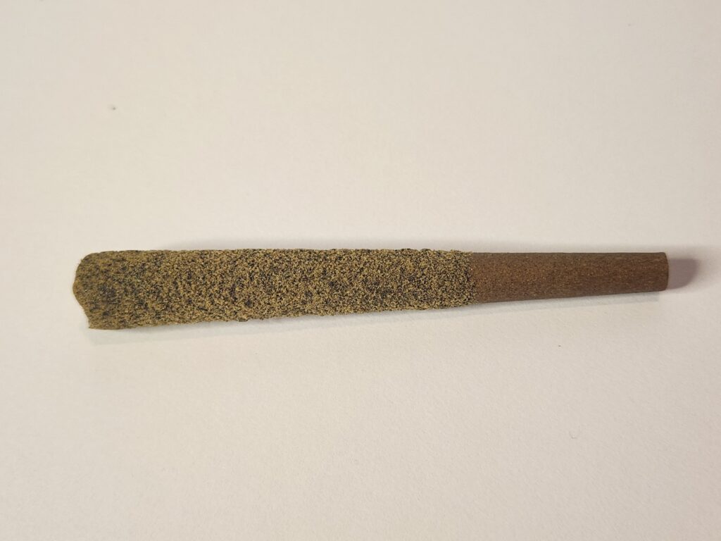 Le joint est en cône, fait de papier de chanvre et recouvert de kief, avec un filtre en papier/carton mesurant environ 1″1/2(+/- 40% du joint) et l’embout est replié sur lui-même. Le joint semble uniformément dense et sans faiblesse au niveau du filtre. Se fume sans problème, avec une cendre blanchâtre et un anneau de résine.