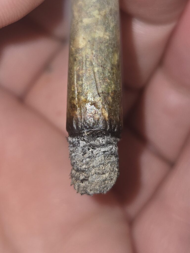 Un tube long et mince en plastique noir opaque qui contient 3 pré roulés de 0,5g. L’étiquette mentionne les taux de T-H-C(22,51%), C-B-D(0,7%) et celui des terpènes totaux(2,0%). On retrouve aussi la liste des terpènes dominants, la classification(hybride) et la lignée(Triangle Kush x 88G13 Hash Plant). Une présentation décente, l’important est là. Le tube ne contenait pas de Boost.