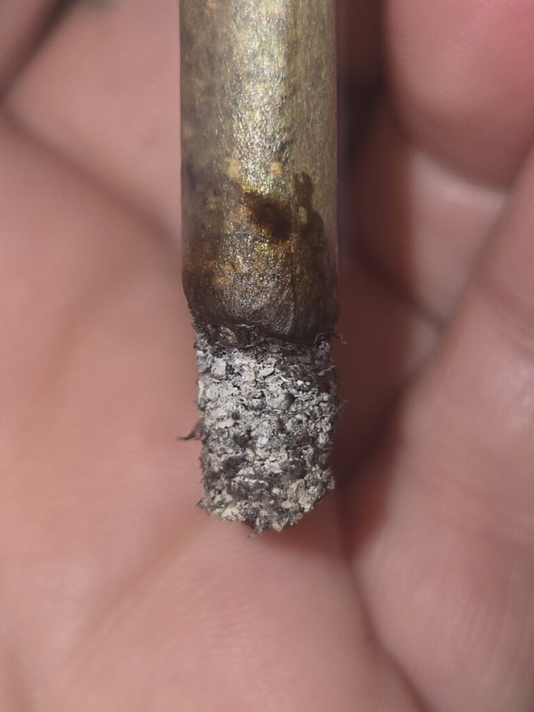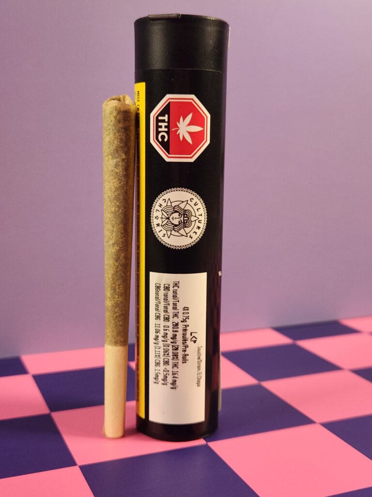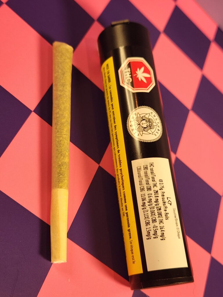 Un tube long et mince en plastique noir opaque qui contient 4 pré roulés de 0,75g. L’étiquette mentionne les taux de T-H-C(28,08%), C-B-D(0,06%), C-B-G(1,11%) et celui des terpènes totaux(2,0%). Le C-B-G est un cannabinoïde similaire au C-B-D dans le sens qu’il n’est pas psychoactif et possède des propriétés anti inflammatoires. On retrouve aussi la liste des terpènes dominants et leur % individuel et la souche en rotation(El Chapo). Une présentation décente, l’important est là. Le tube ne contenait pas de Boost.