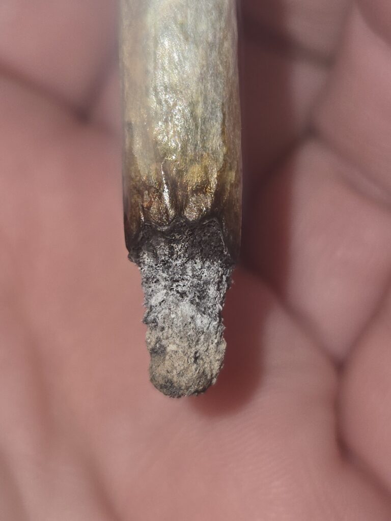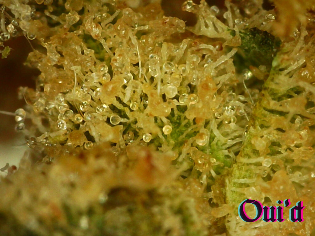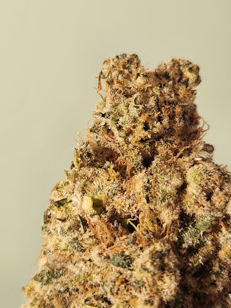 Juste un gros bud. Dense avec un léger rebond. Une bonne balance d’humidité, encore légèrement sticky. Beau bag appeal, structure avec protubérances, on voit bien l’effet « spirale » des « bourgeons » autour de la branche. L’épaisse couche de trichomes dissimule les teintes de vert pâle à foncé et d’orange brûlé des pistils. Au microscope, les trichomes sont longs et intacts. Se fume sans problème avec une cendre grisâtre et un anneau de résine.